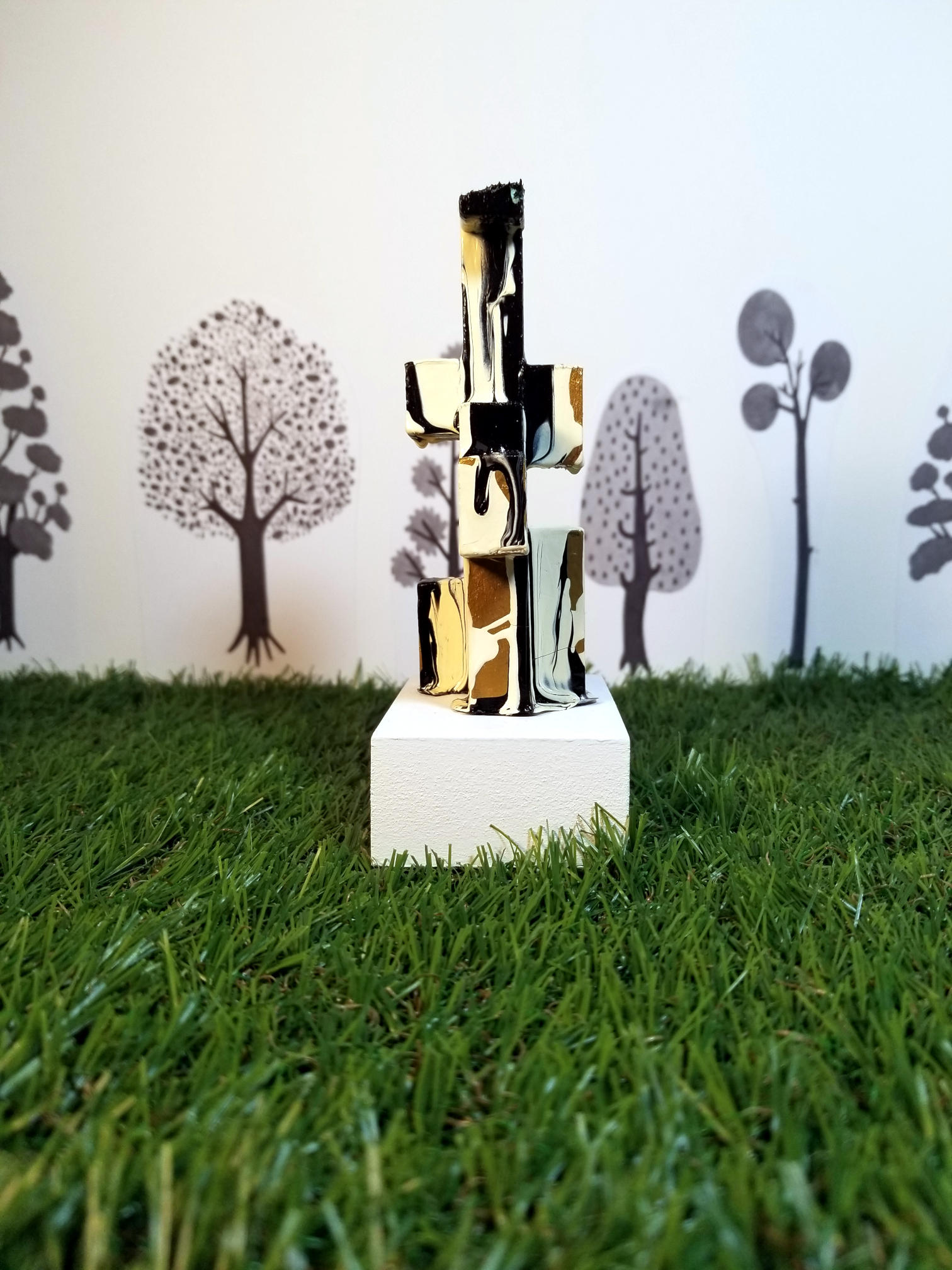 All sculptures are made with wood, glue, acrylic paint & gloss medium. They are permanently attached to their bases. Average size is about 3x4x6. Each sculpture has its own gallery below; click the thumbnails to view larger images.